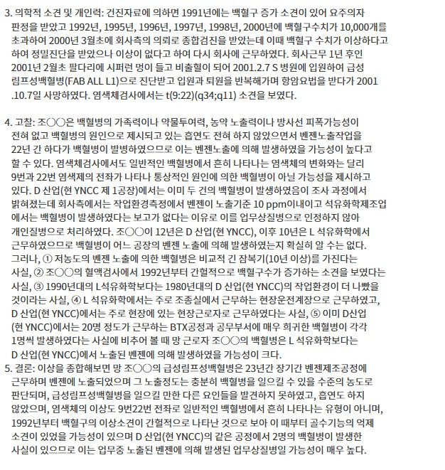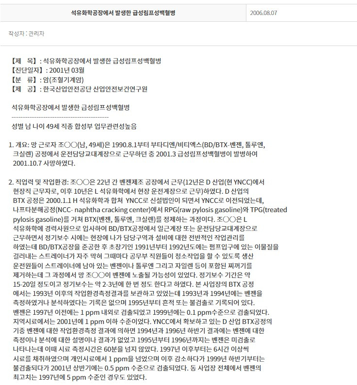 아래 첨부된 내용에서 볼 수 있듯이 석유화학공장에서 벤젠, 톨루엔, 크실렌 공정을 담당하던 직원이 급성림프성백혈병이 발병하여 끝내 사망하였습니다.