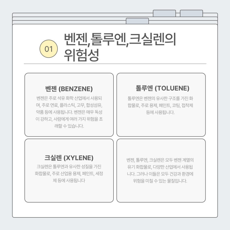 1급 발암물질인 벤젠, 톨루엔, 자일렌이 포함되지 않습니다.